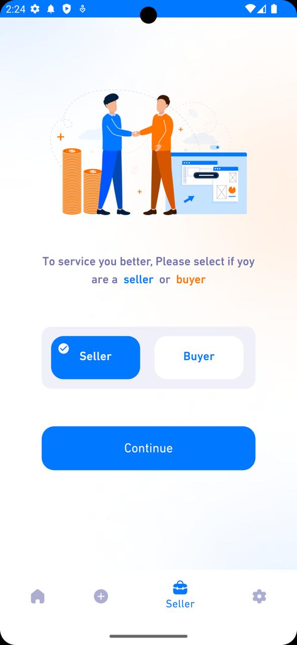 يقوم المستخدم بإنشاء حساب جديد عبر التطبيق باستخدام البريد الإلكتروني . و يختار المستخدم نوع حسابه (بائع أو مشتري) حسب هدفه من استخدام التطبيق